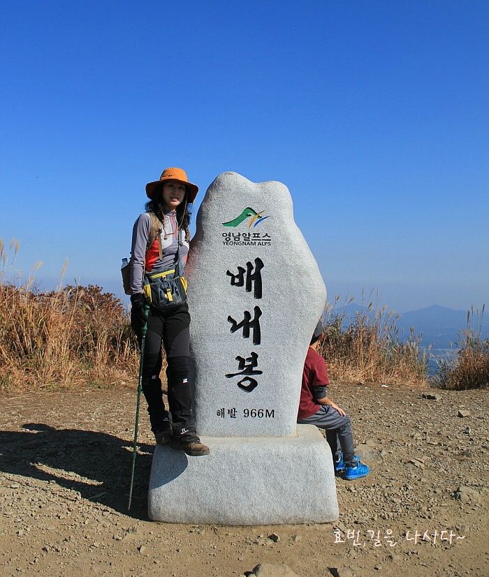 마지막 봉우리 배내봉(966m)에서 인증샷을 남기고 배내고개로 내려선다.
