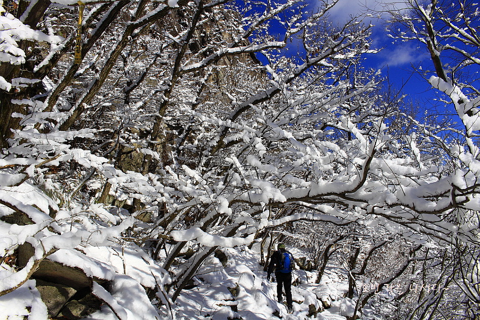 투구봉을 내려서니 파란하늘과 흰 눈송이들이 환상호흡을 맞춰가는데
