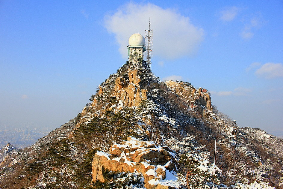 정상의 철탑과 기암절벽위에 세워진 연주대도 보인다.