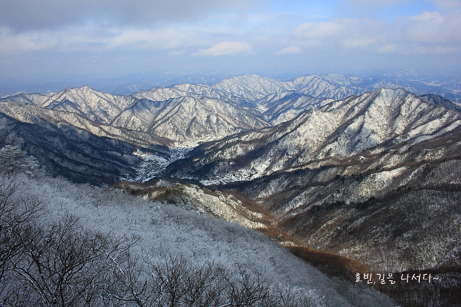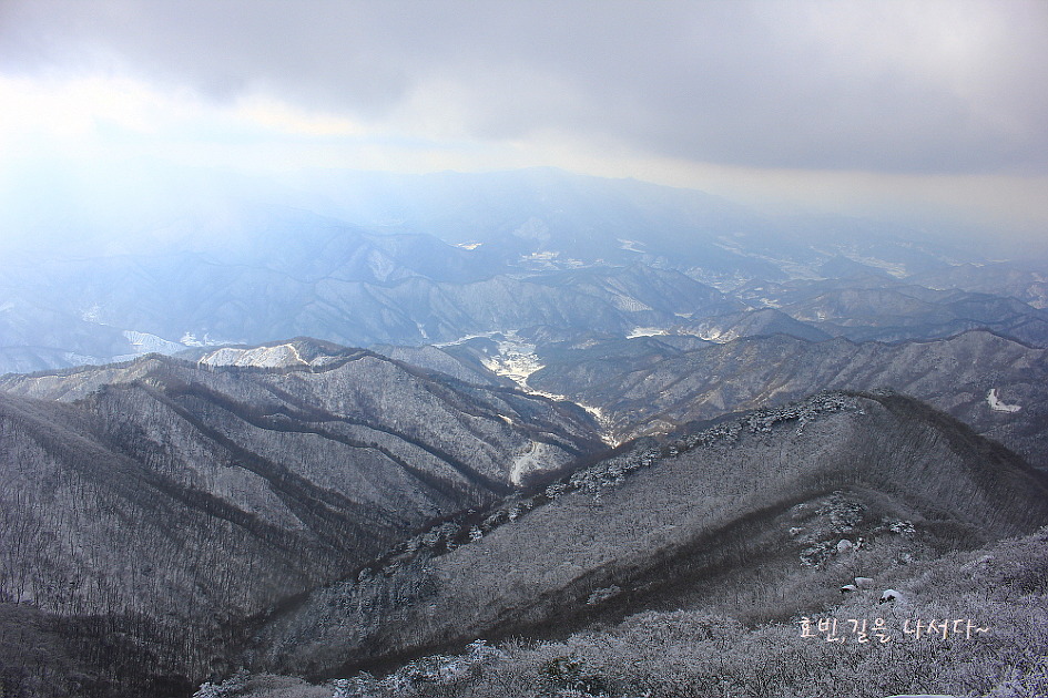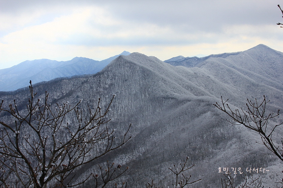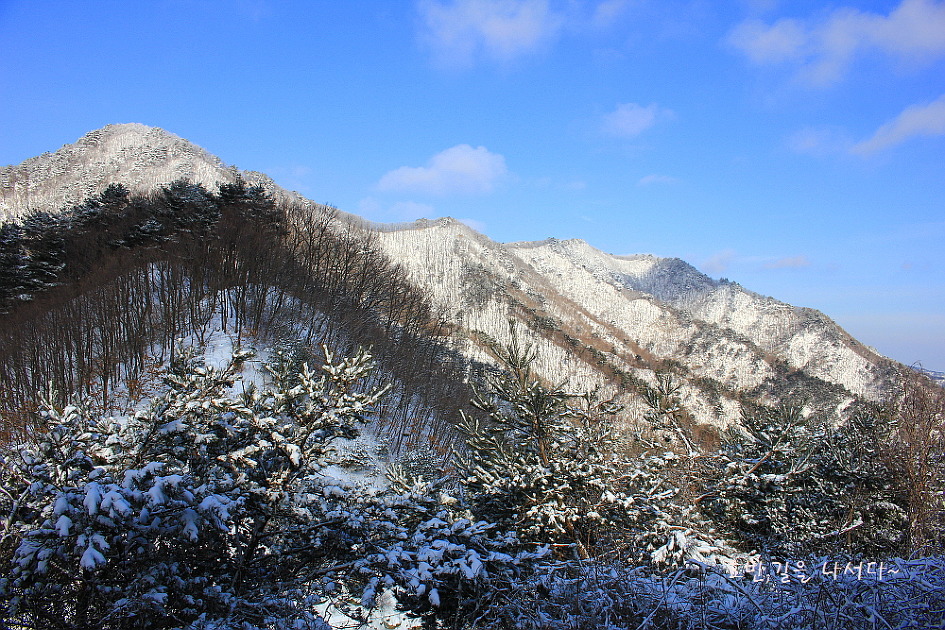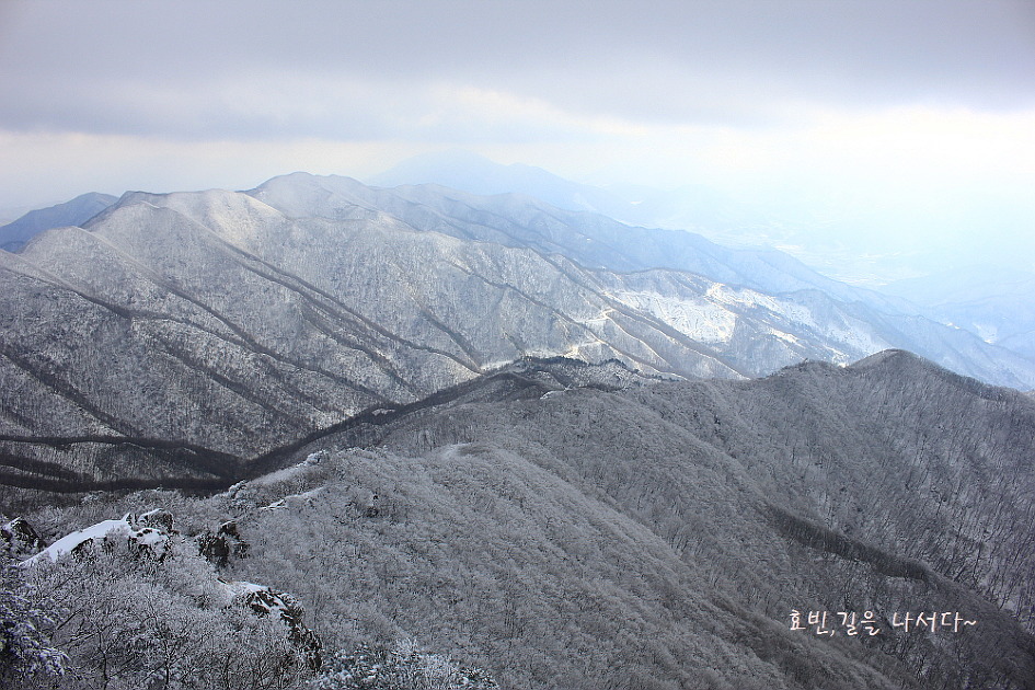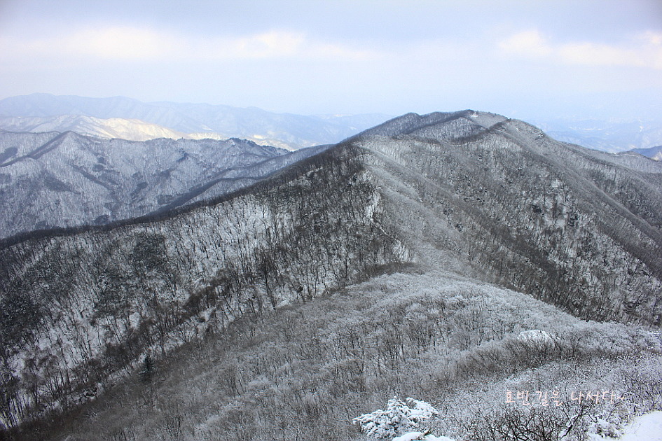 제일 왼쪽 뒤로 흰눈이 더 쌓인 황악산으로 이어진다.