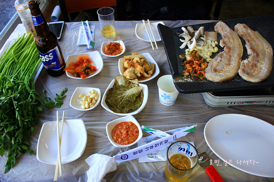 어쩜 저리 삼겹살도 반듯이 잘 잘라놓았던지 앳띤 종업원 총각의 솜씨도 입담도 대단했다.