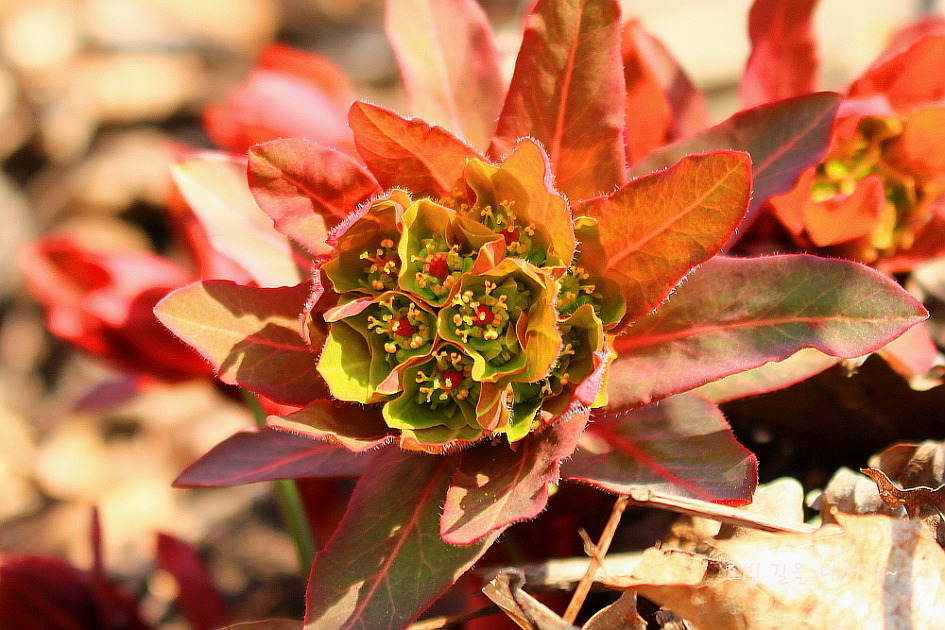 사진에 담아 확대해 보기도 쉽지 않고, 붉은대극에 비해 잎이 가늘다고도 하는데 비교해 봐도 잎의 가늘기로는 별 차이를 느끼지 못하겠다.총포라는 단어부터가 어려울수도 있다. 꽃자루가 단축되어 포가 한 곳에 밀집된 것, 꽃의 밑동을 감싸는 비닐 모양의 조각쯤으로 이해하면 되겠다. 돋아나는 잎은 녹색도 붉은색도 있었다.
