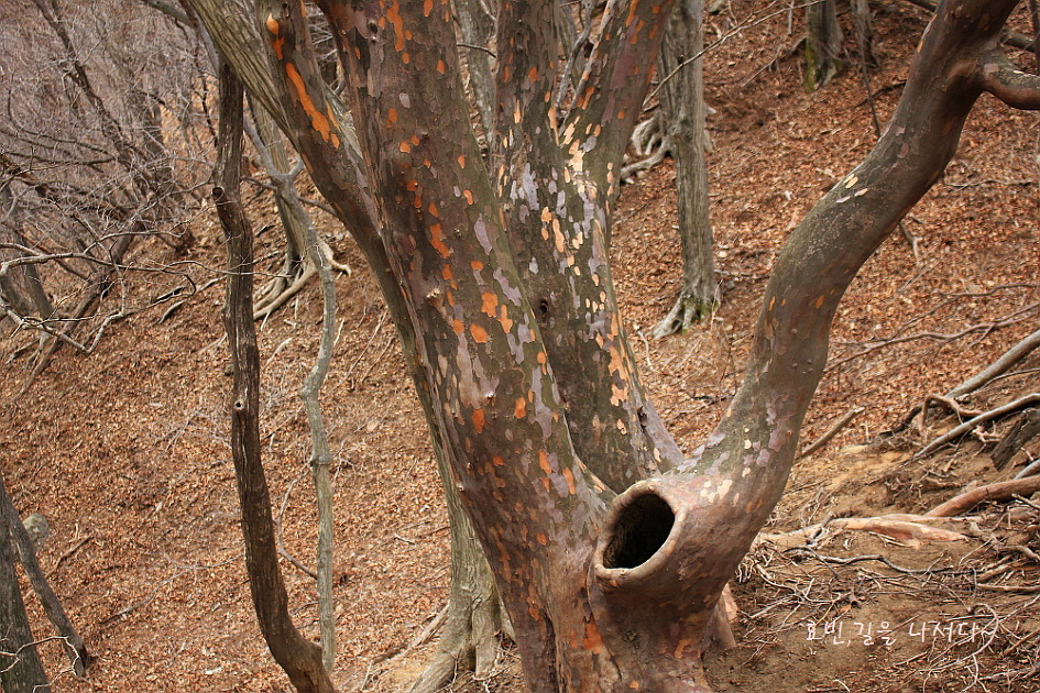매끈한듯 보이면서도 얼룩거리는 수피는 벗겨지는 특징이 있고 마치 어느 부대의 군복 같기도 한..