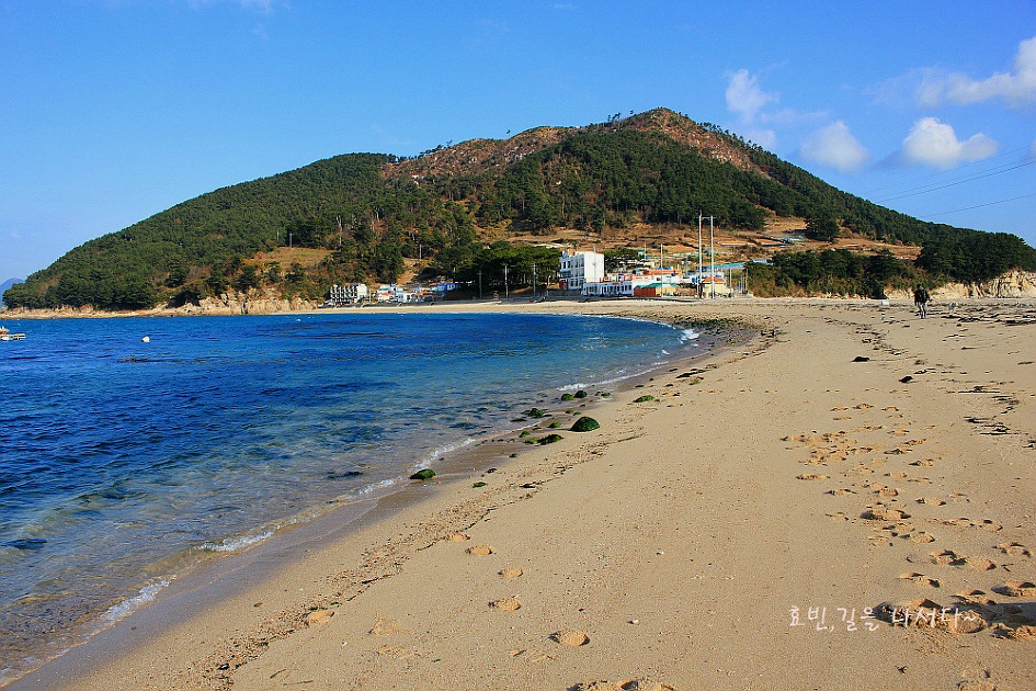 좌측 외항마을이 있는 안섬에서 우측 바깥섬으로 이어진 해변.