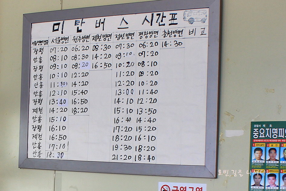 강원도 평창군 미탄면 미탄터미널의 버스 시간표.