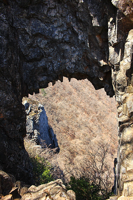 숨은그림찾기~정상 아래 구멍 뚫린 일월문도 보인다.