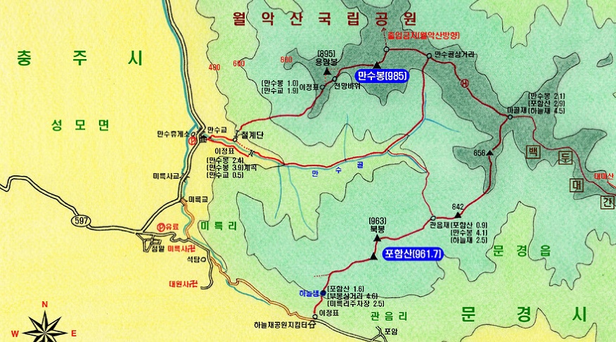 산행코스 :미륵리 버스정류장~미륵사지~하늘재~포암산~만수봉~만수계곡~미륵리(약 13~14km)