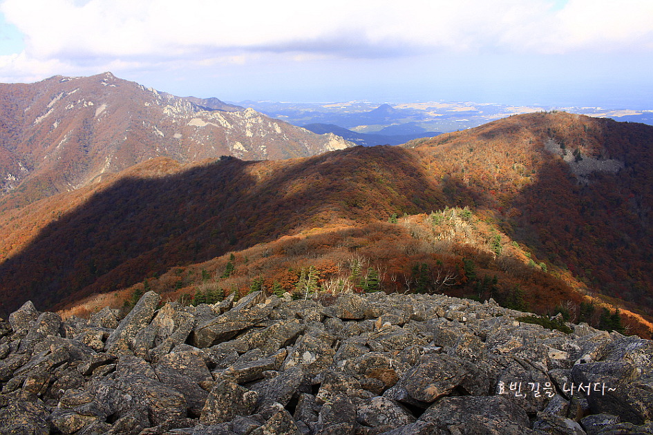 황철북봉을 내려서며 만나는 너덜겅과 저 아래 미시령과 그 위로는 지난번 걸었던 상봉 능선.