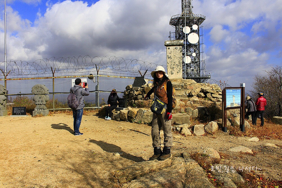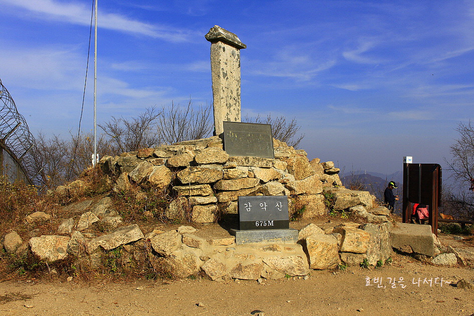 그렇게 숨가쁘게 올라서니 통신탑과 군철조망과 너른 헬기장 공터가 있는 감악산(675m) 정상이다.