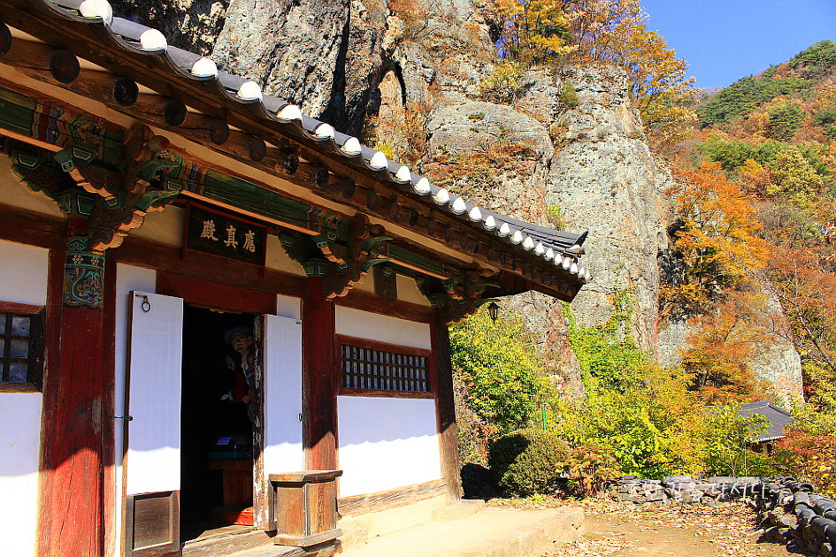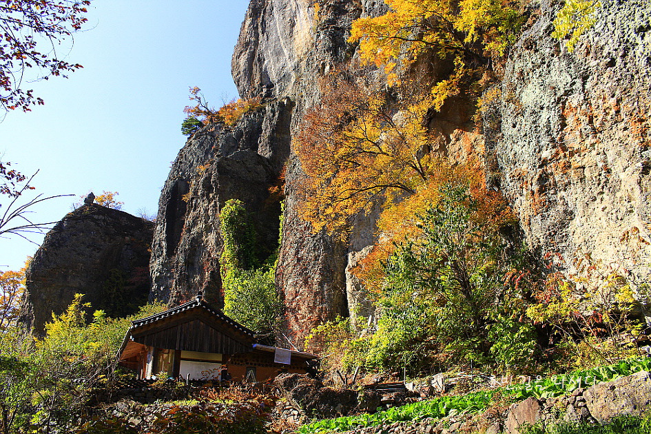 굴에 조그만 암자가 있고 암자 밑은 절벽이다.