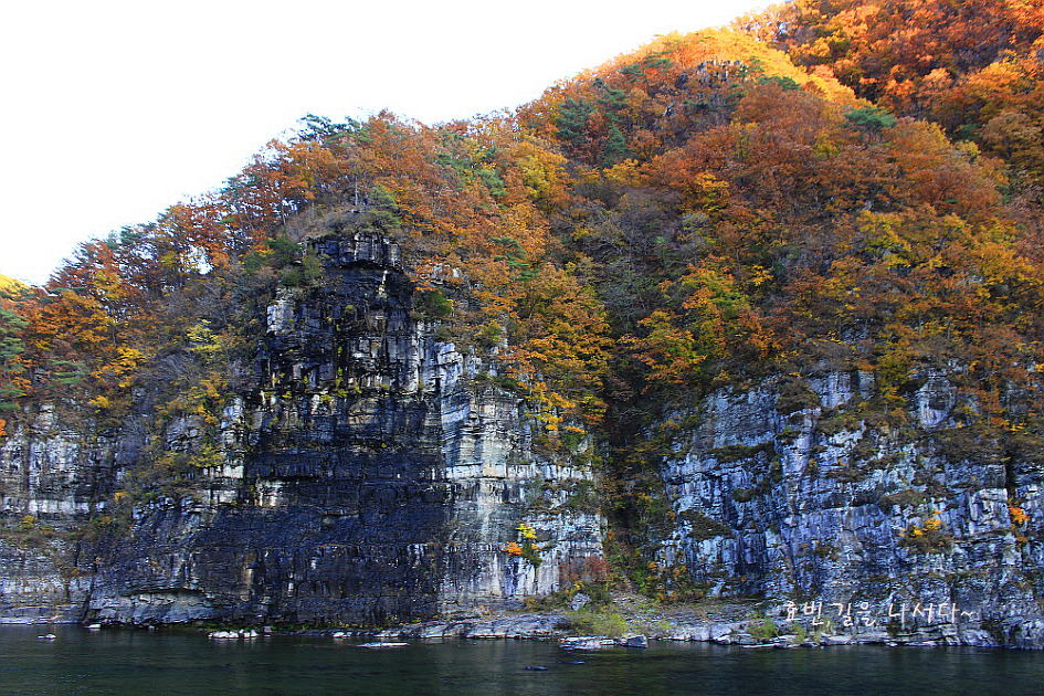 좌측 방금 전 내려온 금강대와 금강굴 절벽이 보이고