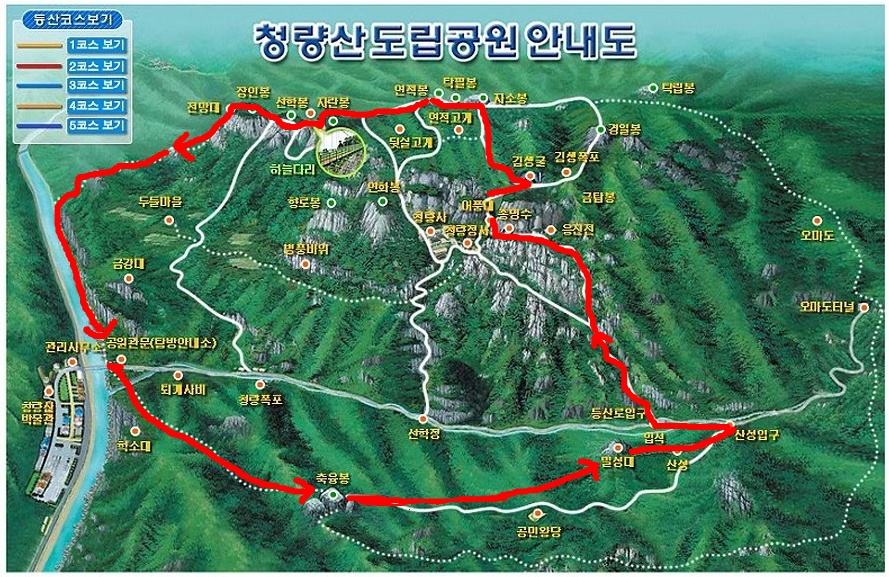 가운데 청량지문 도로따라 올라가면 응진전 올랐던 입석과 산성길이 나오는 것이다.