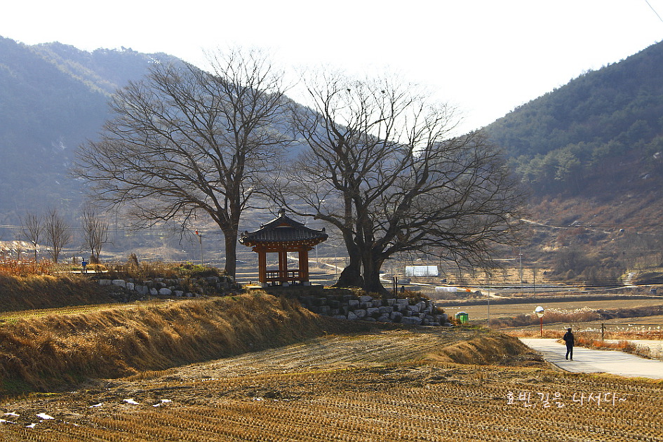 마을 초입 버스정류장 뒤로는 410여년 되었다는 느티나무가 서 있는 곳.