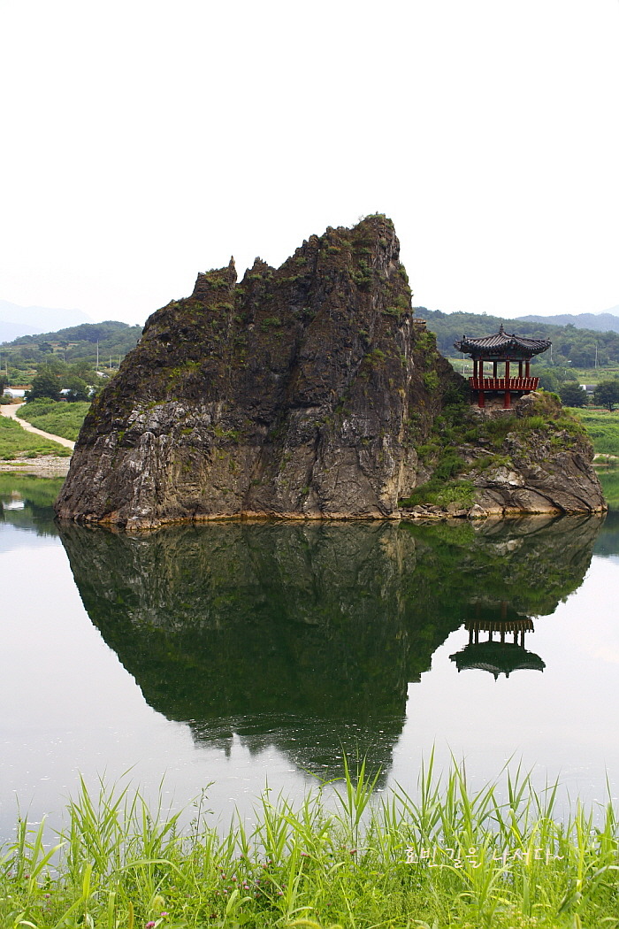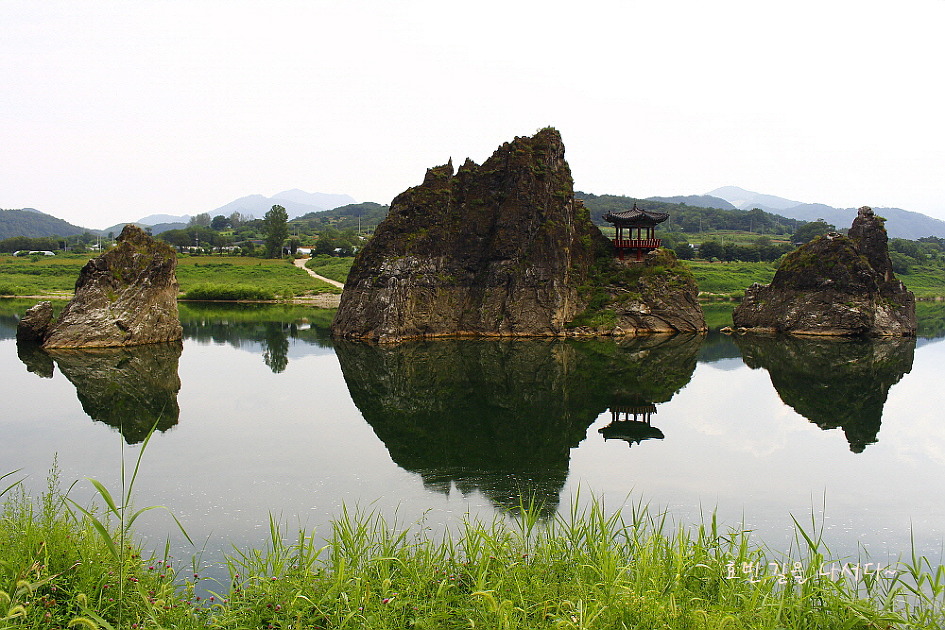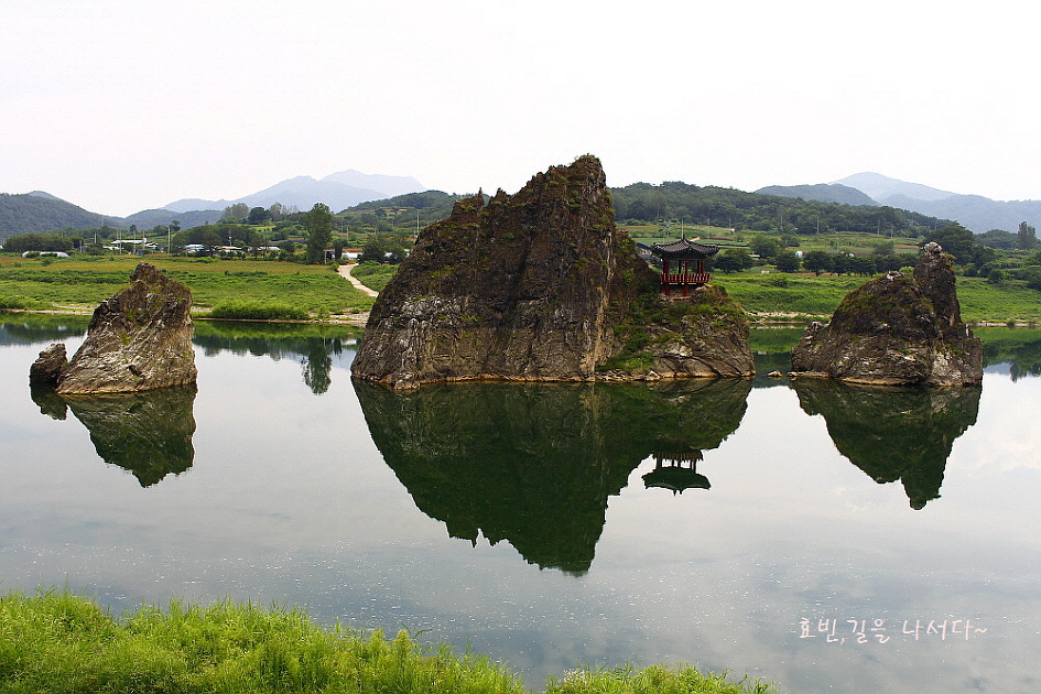 맑은 물이 굽이치는 강 한가운데 세개의 봉우리가 우뚝 솟아 있다.