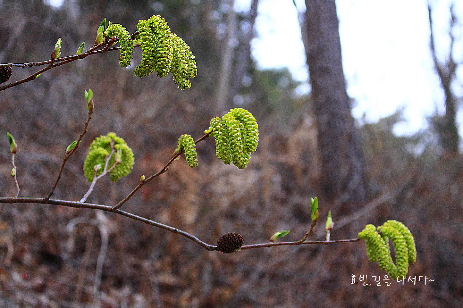 사방오리나무의 길다란 수꽃과 바로 좌측으로 조그맣게 위로 향한 암꽃도 보인다.