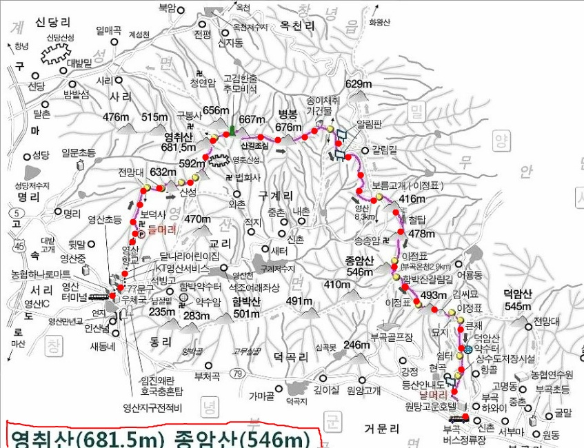 등산코스 : 영산터미널~보덕사~영취산~병봉~종암산~부곡온천~부곡터미널(약 14km로 느리게 느리게 7시간.)