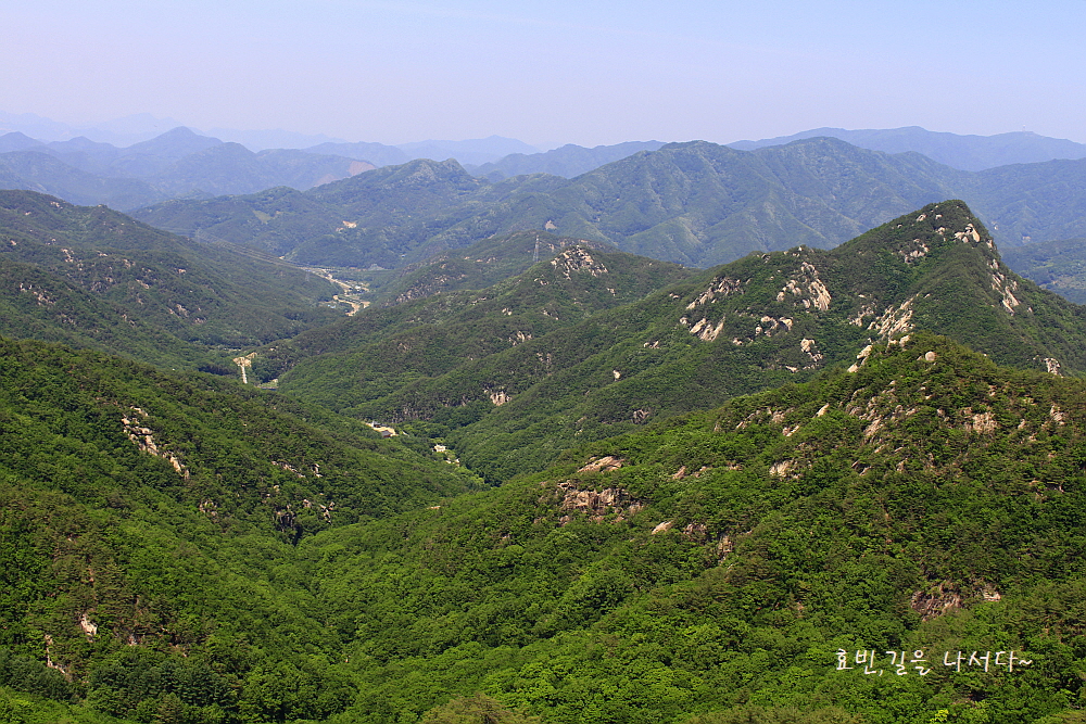 아래로는 방곡리에서 도로따라 올라왔던 길이 보이고 그 위 건너편으로는