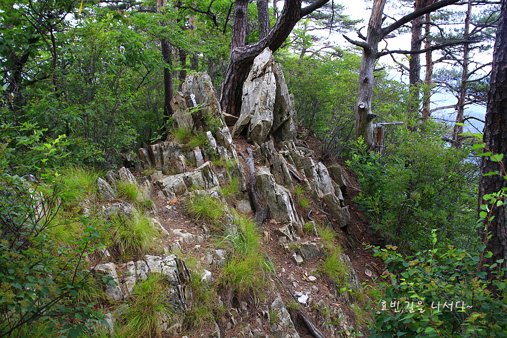 날카로운 바윗길을 지나고, 울창한 소나무 사이로 계단길을 따라 내려선다.