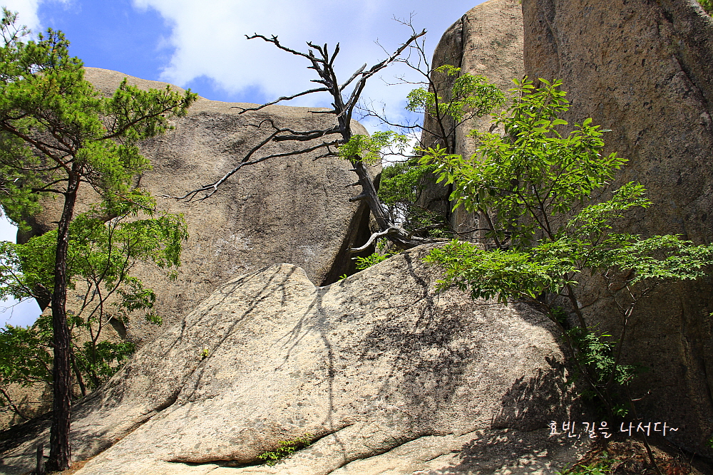 소나무는 기본이고, 하산하다 만나는 하늘벽 위용에 시선을 빼앗겨 버린다.
