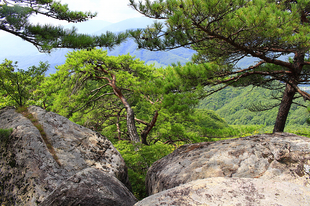 가운데 뒤로 둥그스름한 대미산과 그 바위 우측 뒤는 문수봉, 맨 우측으로 황장산이다.