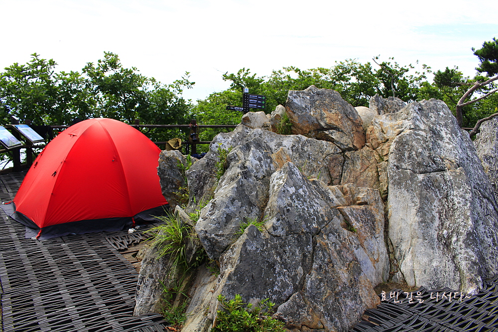 등로에 올라서면 상징처럼 서 있는 돌탑과 막걸리와 지짐, 냉커피 등을 파는