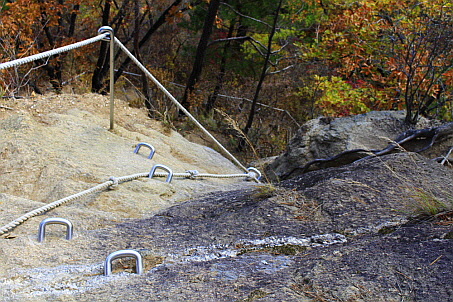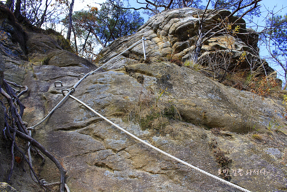 밧줄을 잡고 날망을 오르고 겨울철이라면 특히나 주의가 필요한 코스다.