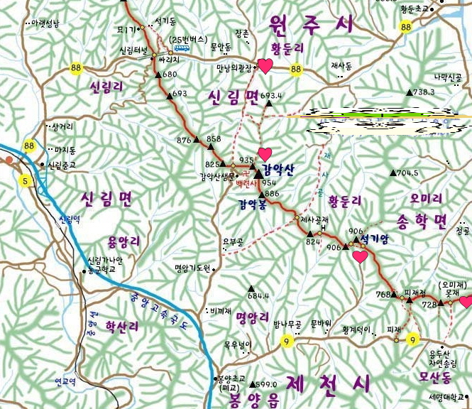 산행코스 : 창촌(만남의광장)~감악1,2,3봉(원주)~감악산(제천)~석기암봉~피재점~용두산~