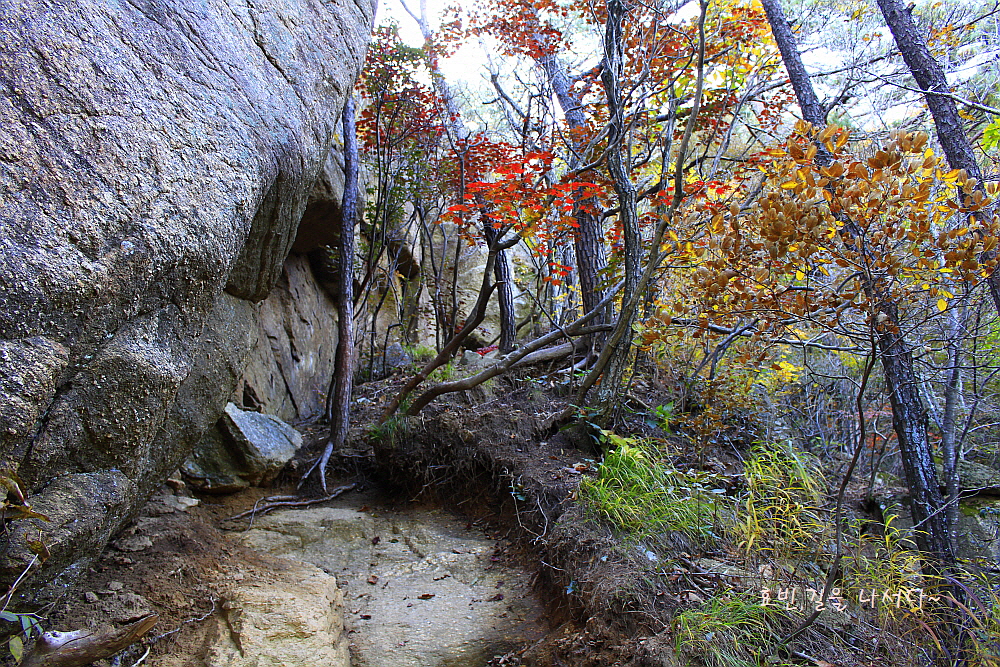 흙길을 지나다 다시 급경사 바위지대를 오를 것이다.
