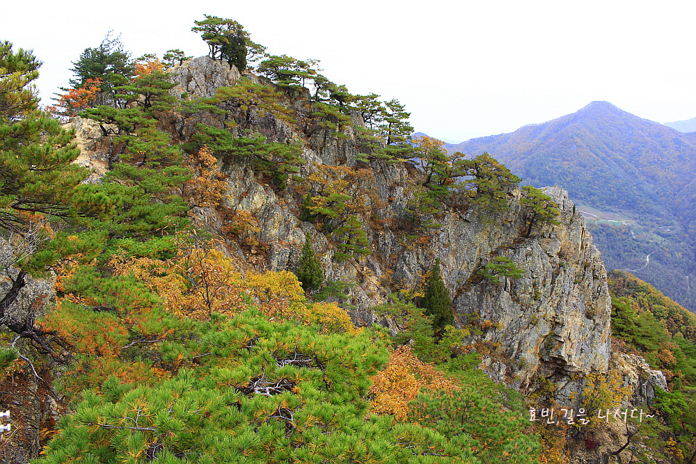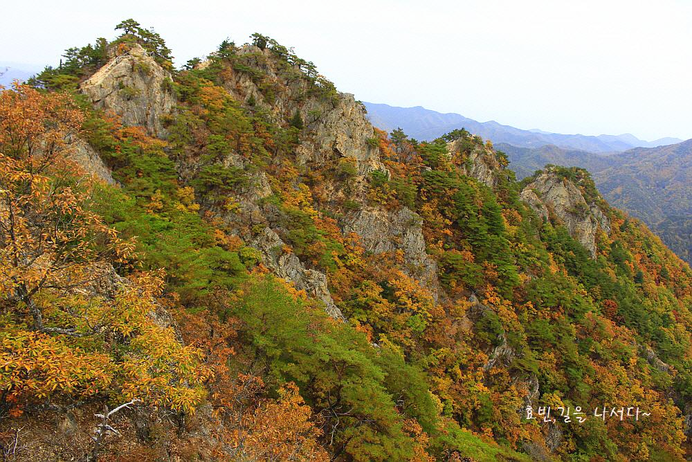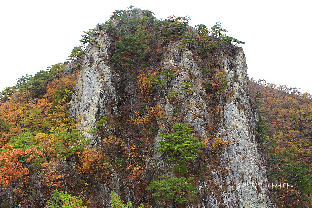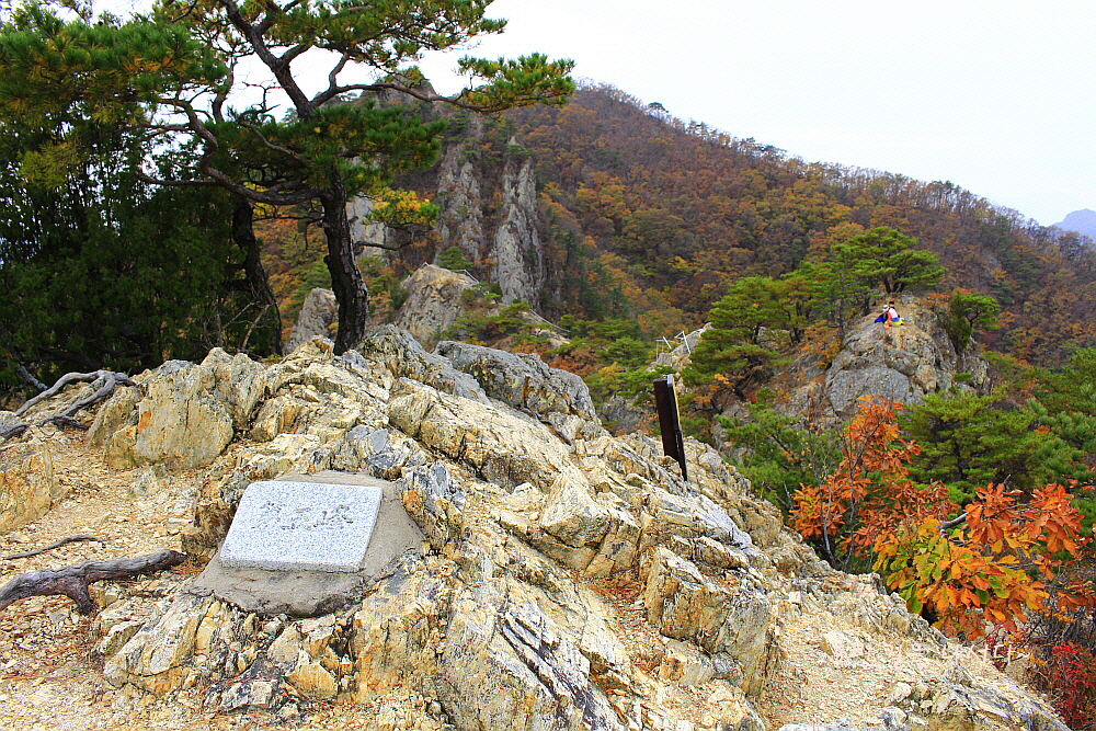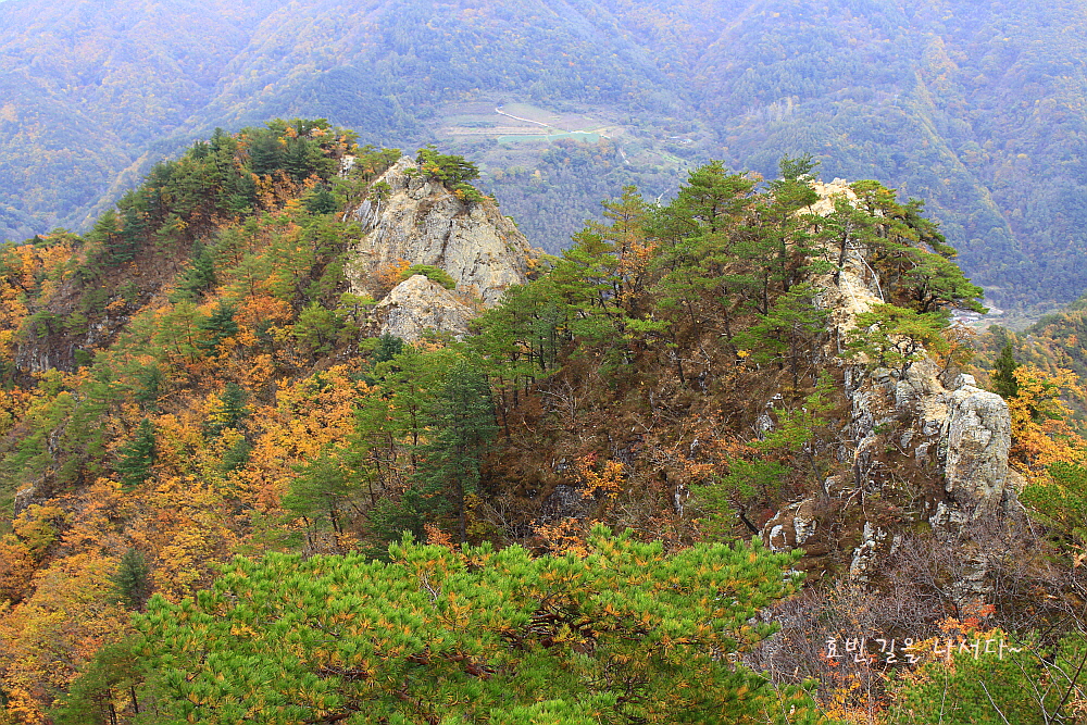 병풍처럼 뒤를 두른 암봉들과 단풍의 어우러짐은 자체로 볼거리가 되었다.