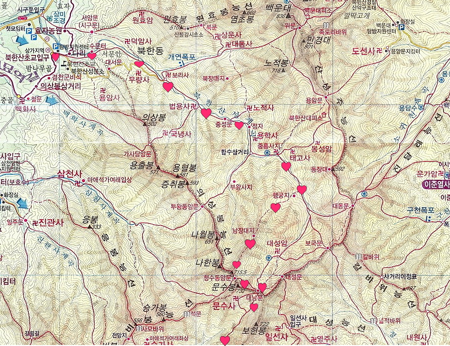 북한산 조망처인 노고산 흥국사와 솔고개를 비롯 우이령 오봉산석굴암 입구, 송추 등
