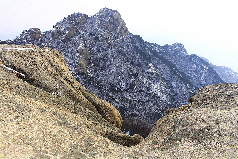 좌측 정상인 백운대와 그 앞으로 노적봉이 마치 하나의 봉우리인듯 겹쳐 보이고