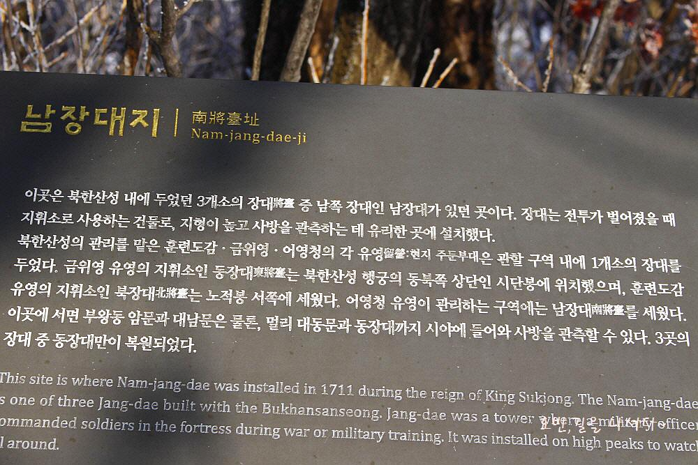 아까 말했듯 북한산성엔 3개의 장대가 있었으나 동장대만 남았고, 남장대와 북장대는 터만 자리하고 있다.