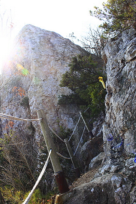 금줄 우측으로 희미한 산길이 나있어 무작정 치고 올라선다. 대충 어디든 나올거라 생각했기 때문에 큰 걱정은 하지 않는다. 다만, 길이 맞나 싶은 약간의 의심과 미끄러지는 낙엽 비탈길에 힘에 부칠 뿐이다.
